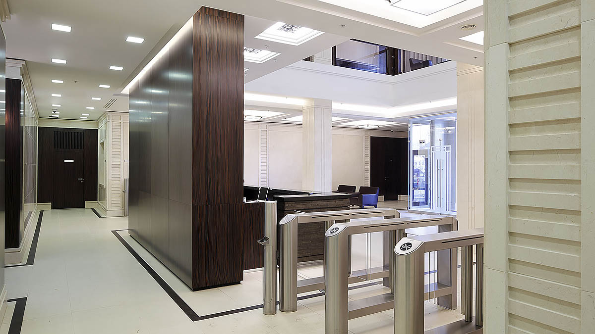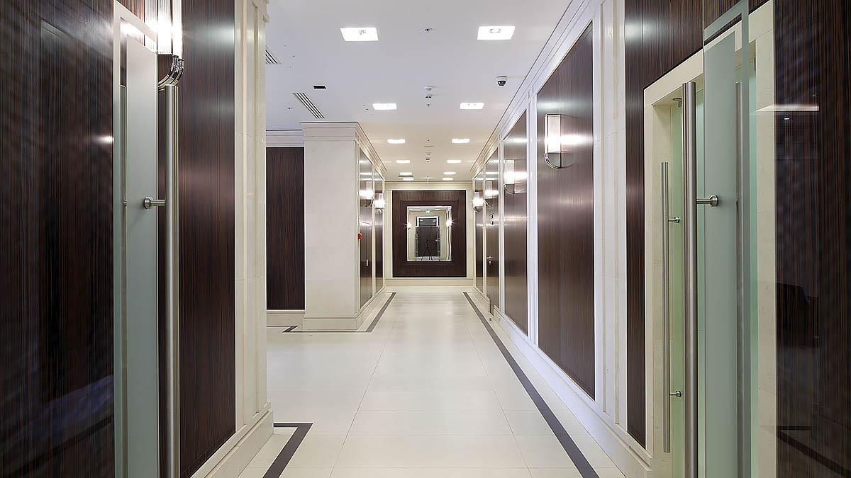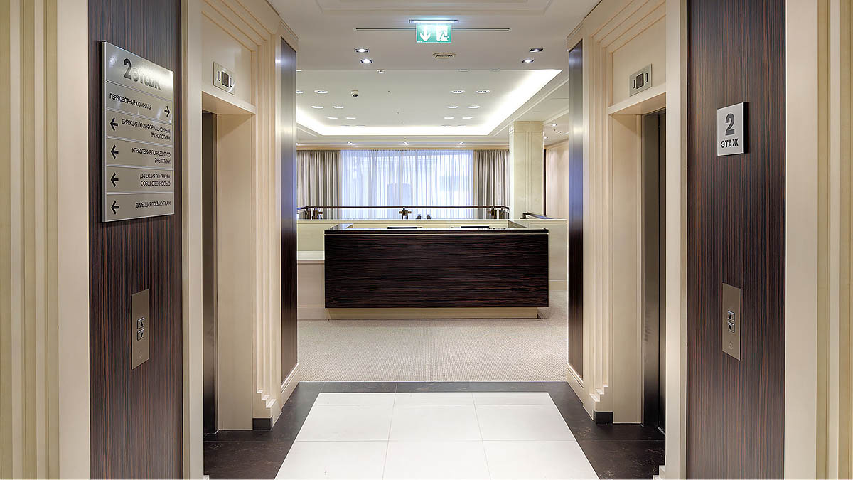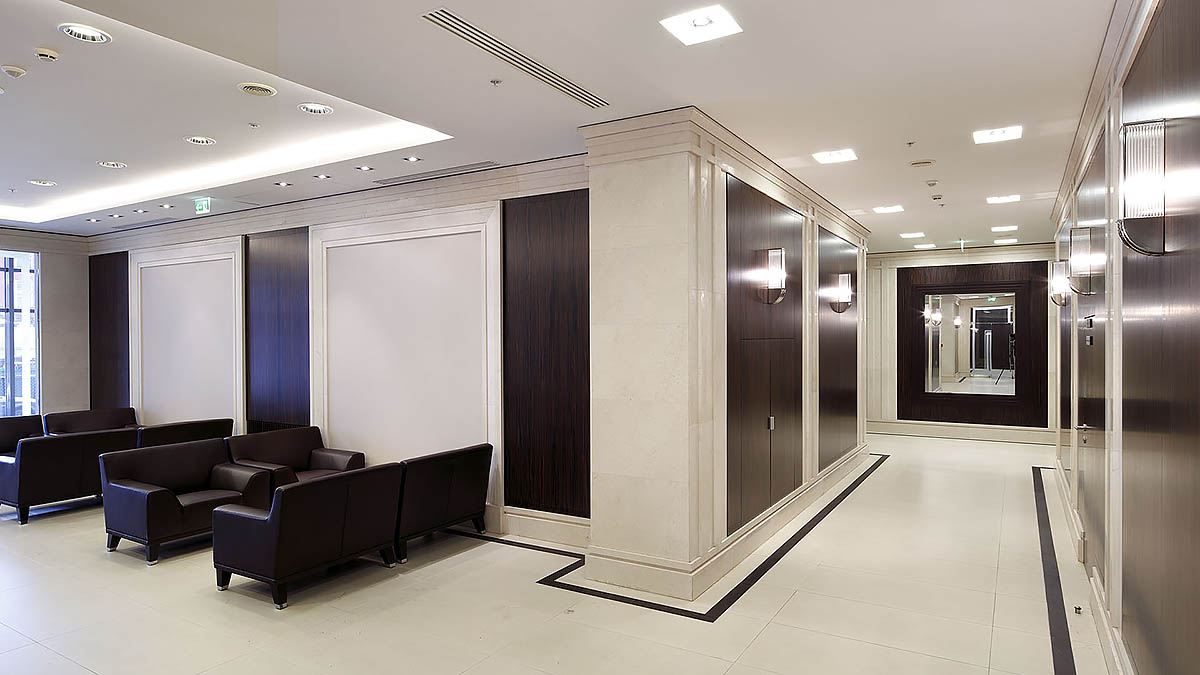 Для этого проекта нашими силами выполнены работы по разработке общих архитектурных чертежей, монтажных схем, деталировочных чертежей, а затем и отделочные работы мрамором турецкого происхождения. Работы включали в себя облицовку стен, мощение полов, укладку ступеней, устройство декоративных обрамлений лифтов, колонн и карнизов. Распил плит и изготовление массивных архитектурных элементов производились на нашей фабрике.