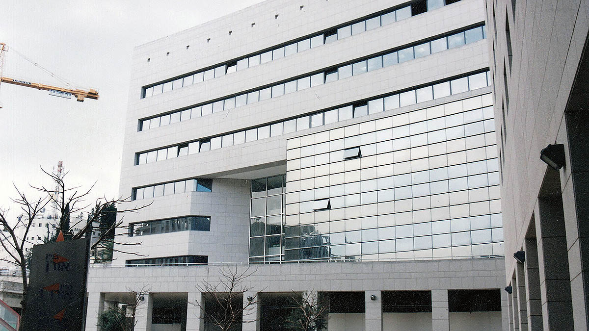 Три офисных здания окружают внутренний дворик бизнес-центра в районе Шикмона города Хайфа.
