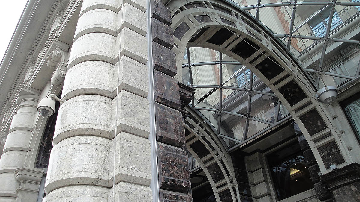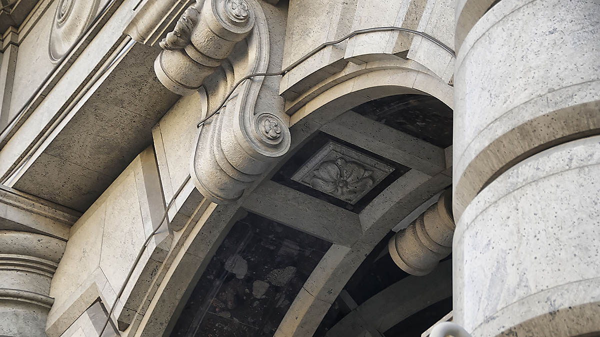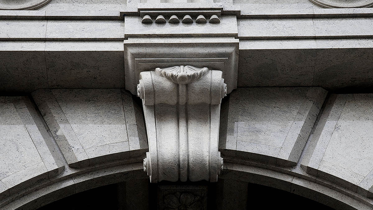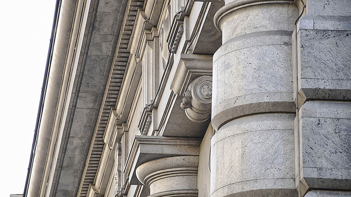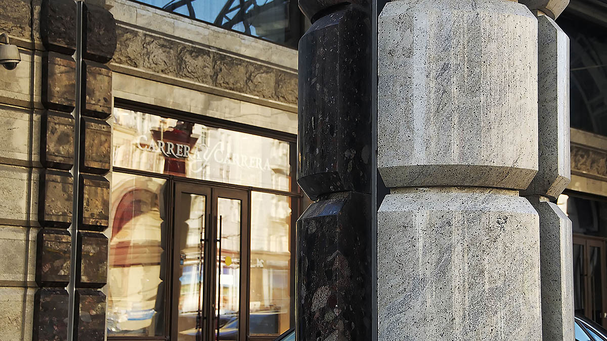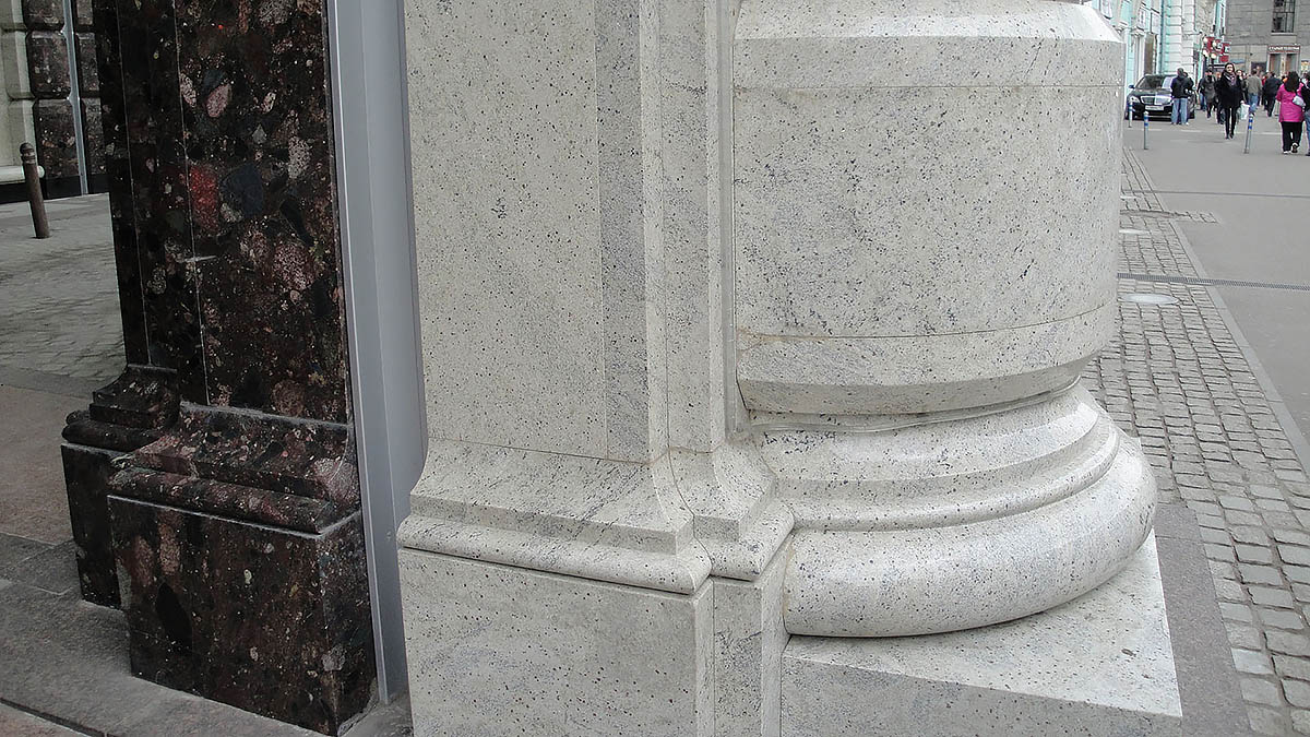 Гранитный фасад классического стиля включает в себя замковые камни, пьедесталы, аркады, колонны сложных геомертических форм, а также облицовку стен.