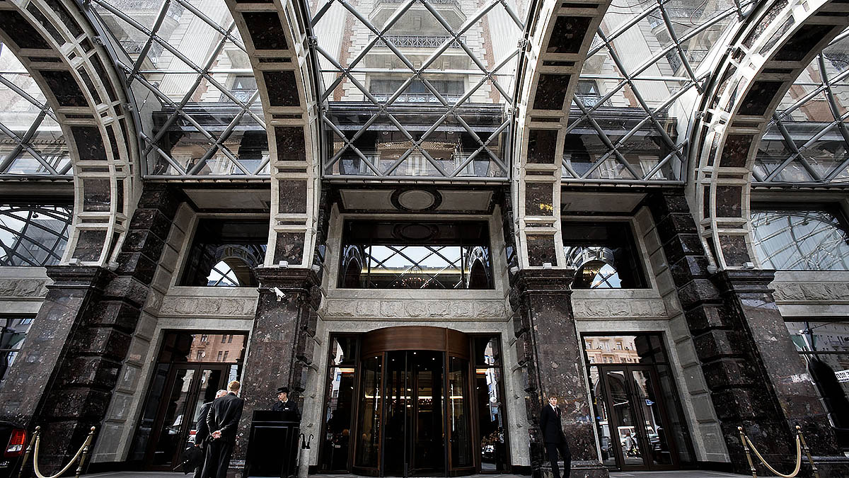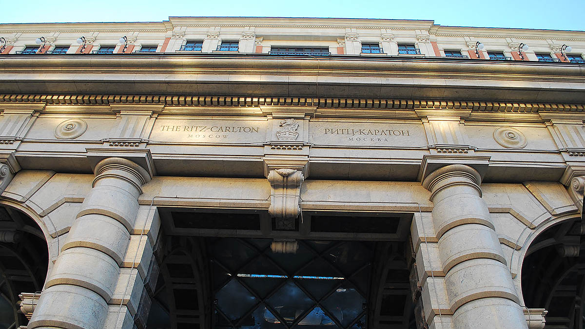 Первые два этажа фасада отеля отделаны гранитом. Для этого проекта были отобраны два сорта гранита — бразильский Palladio и индийский Kashmir White.